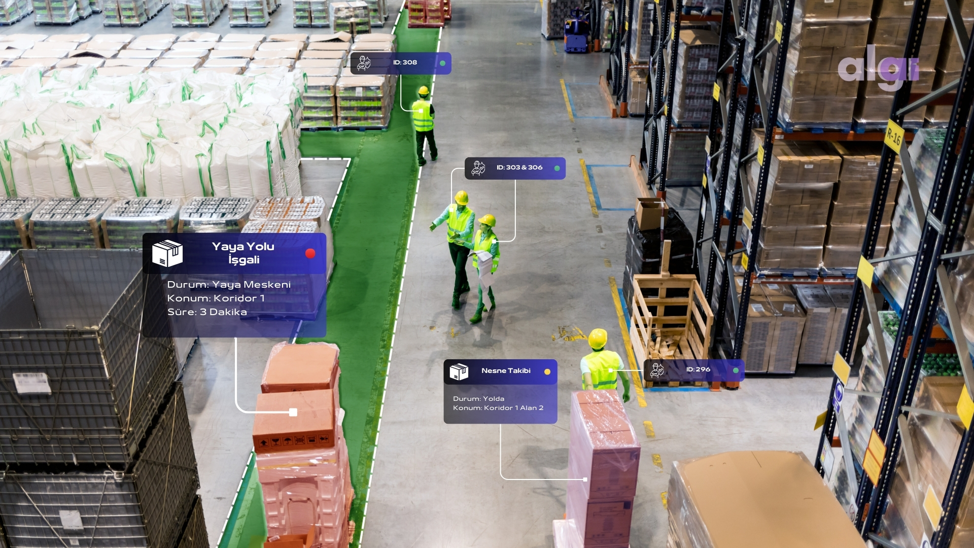 Depo ve lojistik alanlarında forklift kullanımı gibi tehlikeli durumlar gerçek zamanlı analizlerle izlenir.